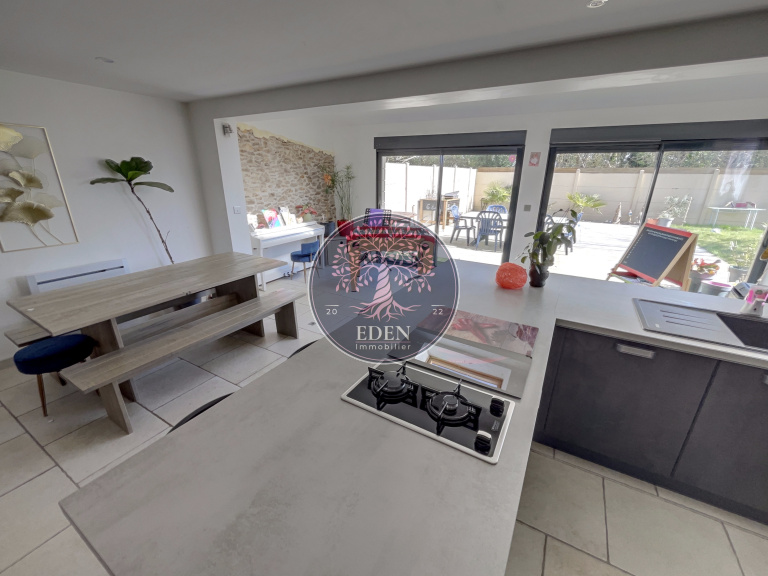 Entrée, séjour et cuisine aménagée et équipée ouverte de 55M2, dégagement, deux chambres, salle d'eau, buanderie, WC.