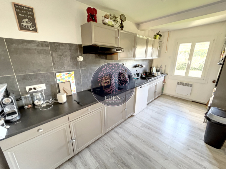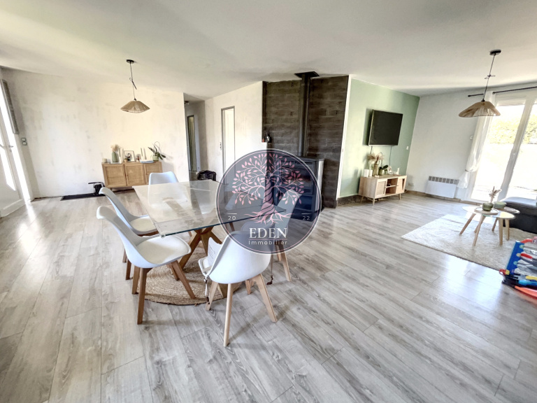Entrée sur Séjour Double avec Cuisine aménagée et équipée, Salle d'eau, Wc, 4 Chambres. Garage indépendant, Carport.