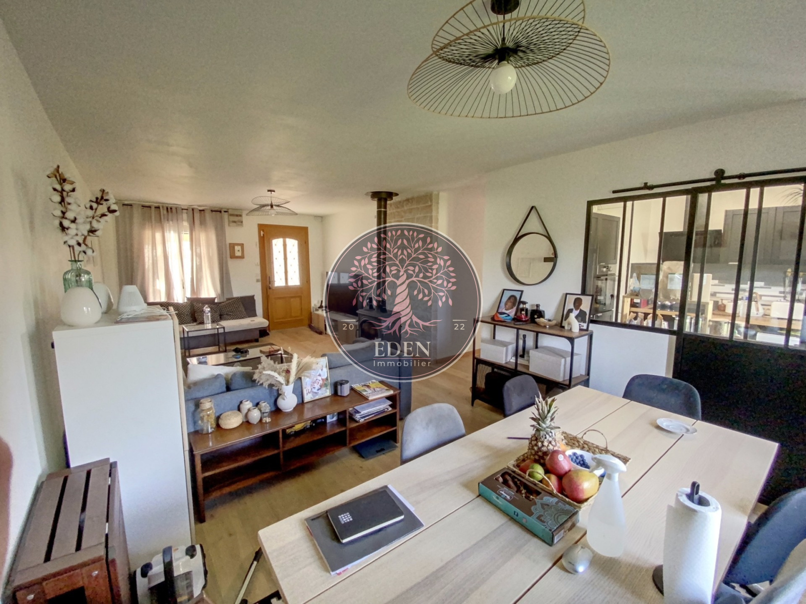 Maison de plain pied entièrement rénovée sur 1000 m² de terrain comprenant : Entrée, salon-séjour, cuisine, dégagement, 4 chambres, salle d'eau avec wc.