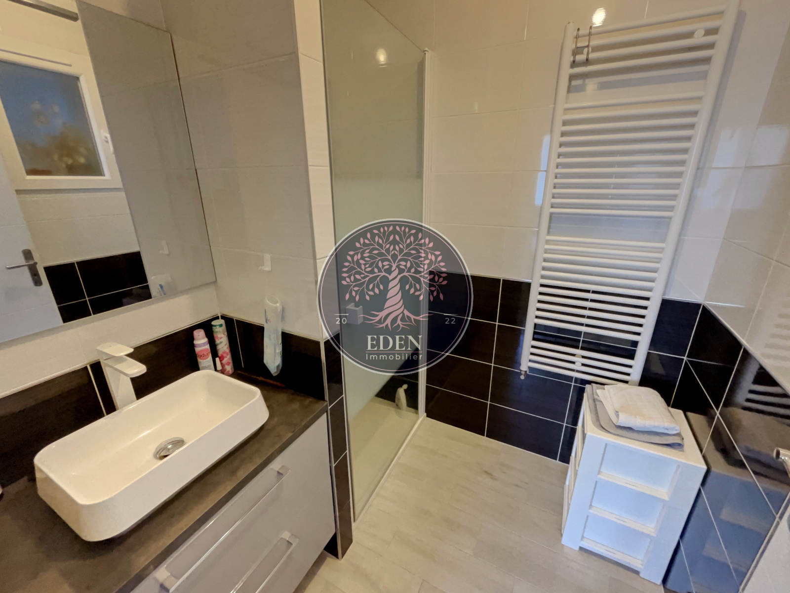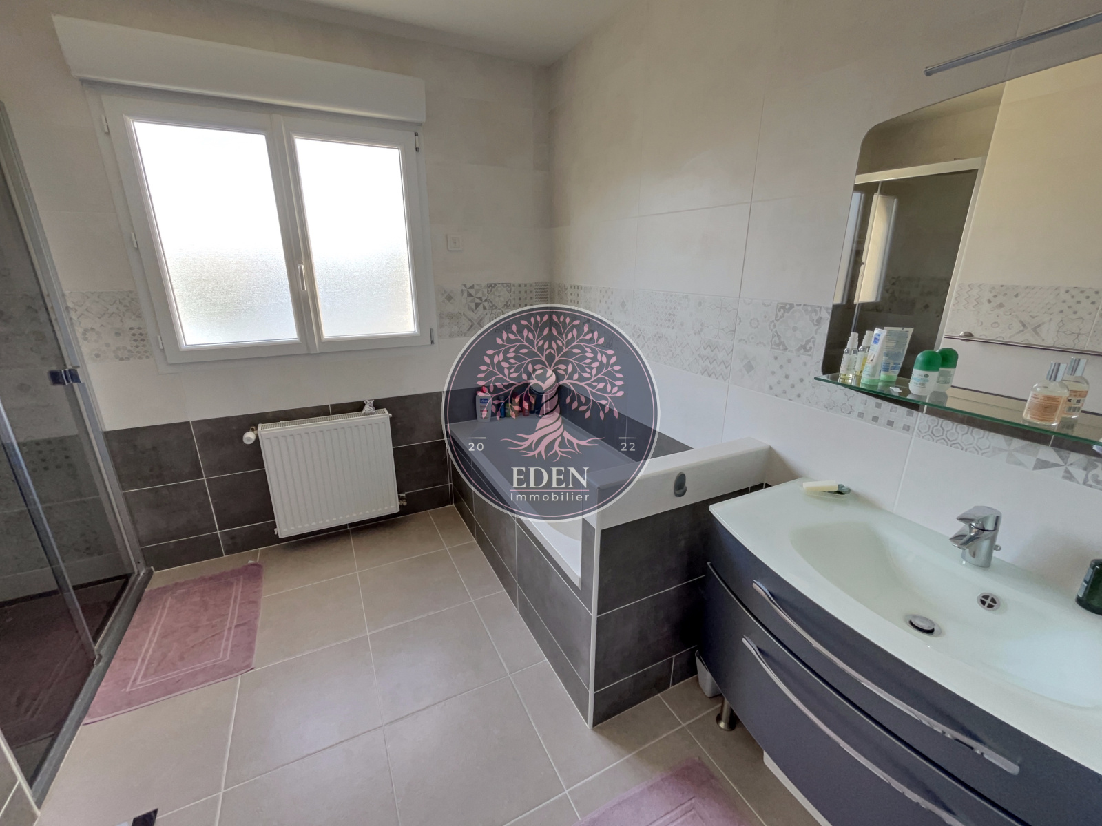 L'équipe Eden Immobilier vous présente cette maison édifiée sur 680m² de terrain environ comprenant : entrée, salon:séjour, cuisine aménagée et équipée, une suite parentale avec salle d'eau, un bureau et WC. A l'étage, un palier dégagement desservant trois chambres, salle de bains avec douche et WC.