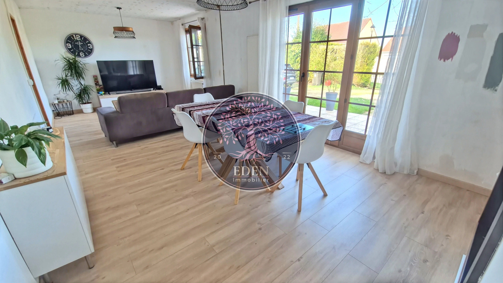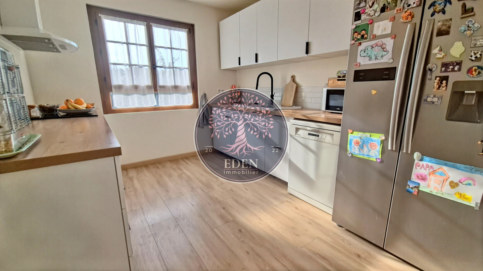 Maison de plain pied comprenant : entrée, cuisine équipée neuve, séjour double de 30m² avec insert, 2 chambres, chambre avec dressing et salle d'eau privative, salle de bains, wc, buanderie.