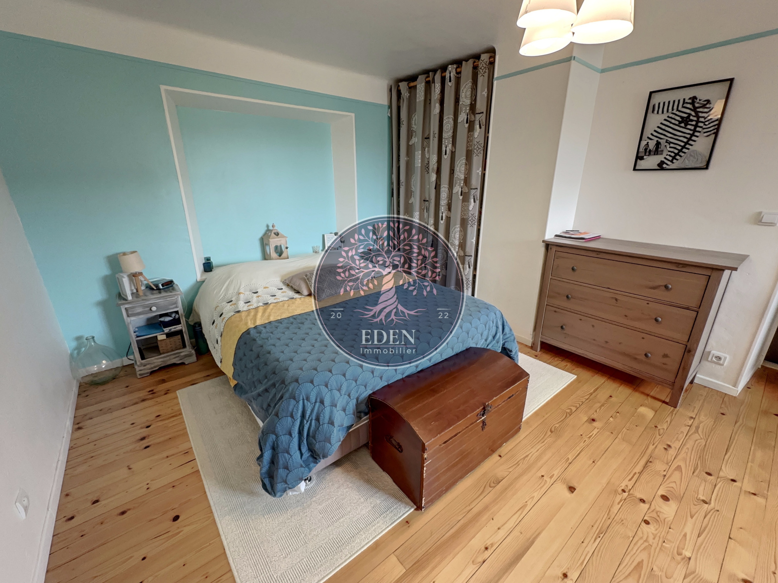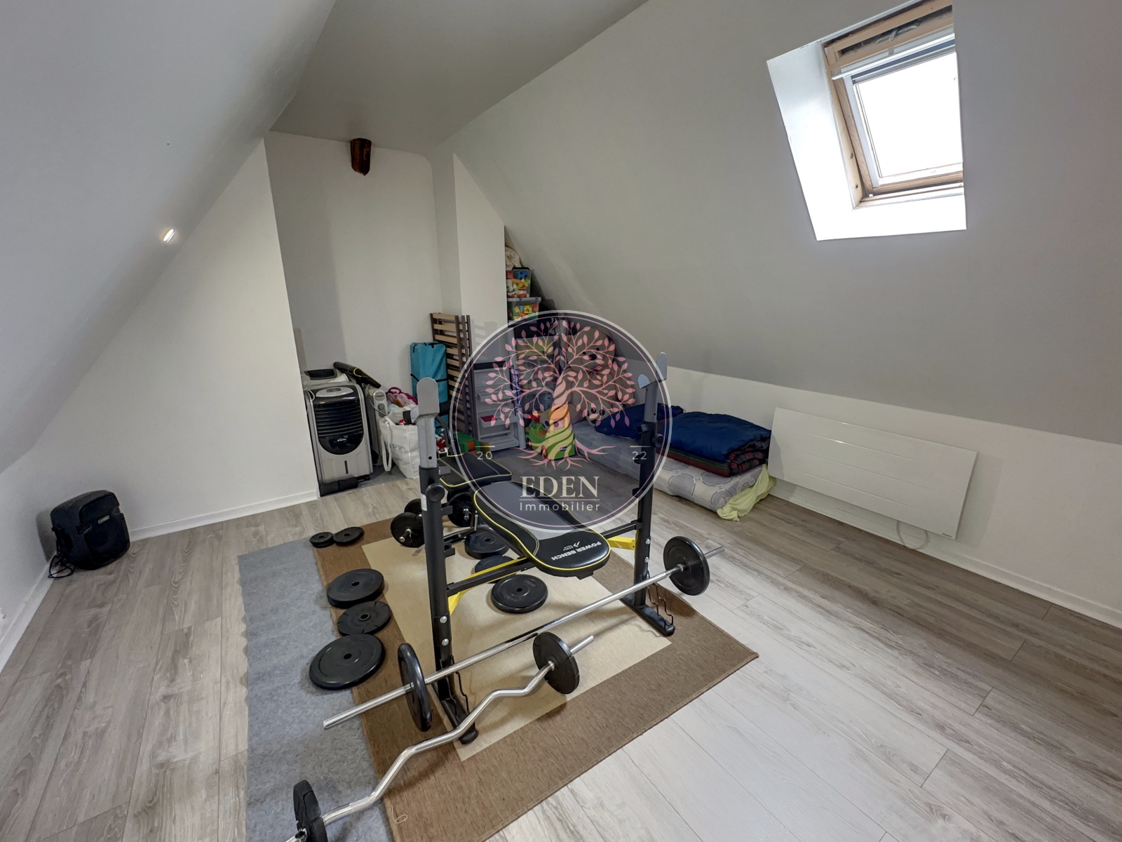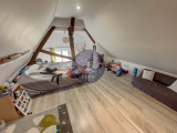 A l'étage, nous retrouvons un vaste palier desservant deux chambres.