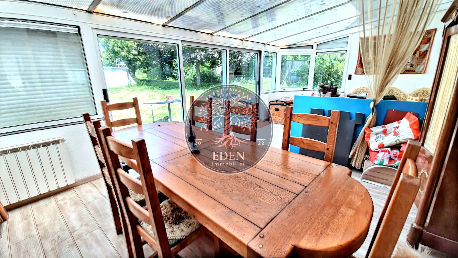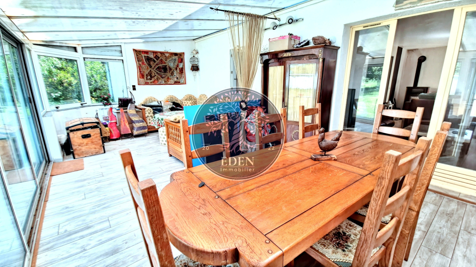Maison de 160m² comprenant : entrée, wc, cuisine, salon de 24m², véranda de 27m², chambre avec salle d'eau, chambre ou bureau, buanderie. A l'étage : palier avec mezzanine, 4 chambres, salle d'eau, salle de bains avec wc. Atelier.