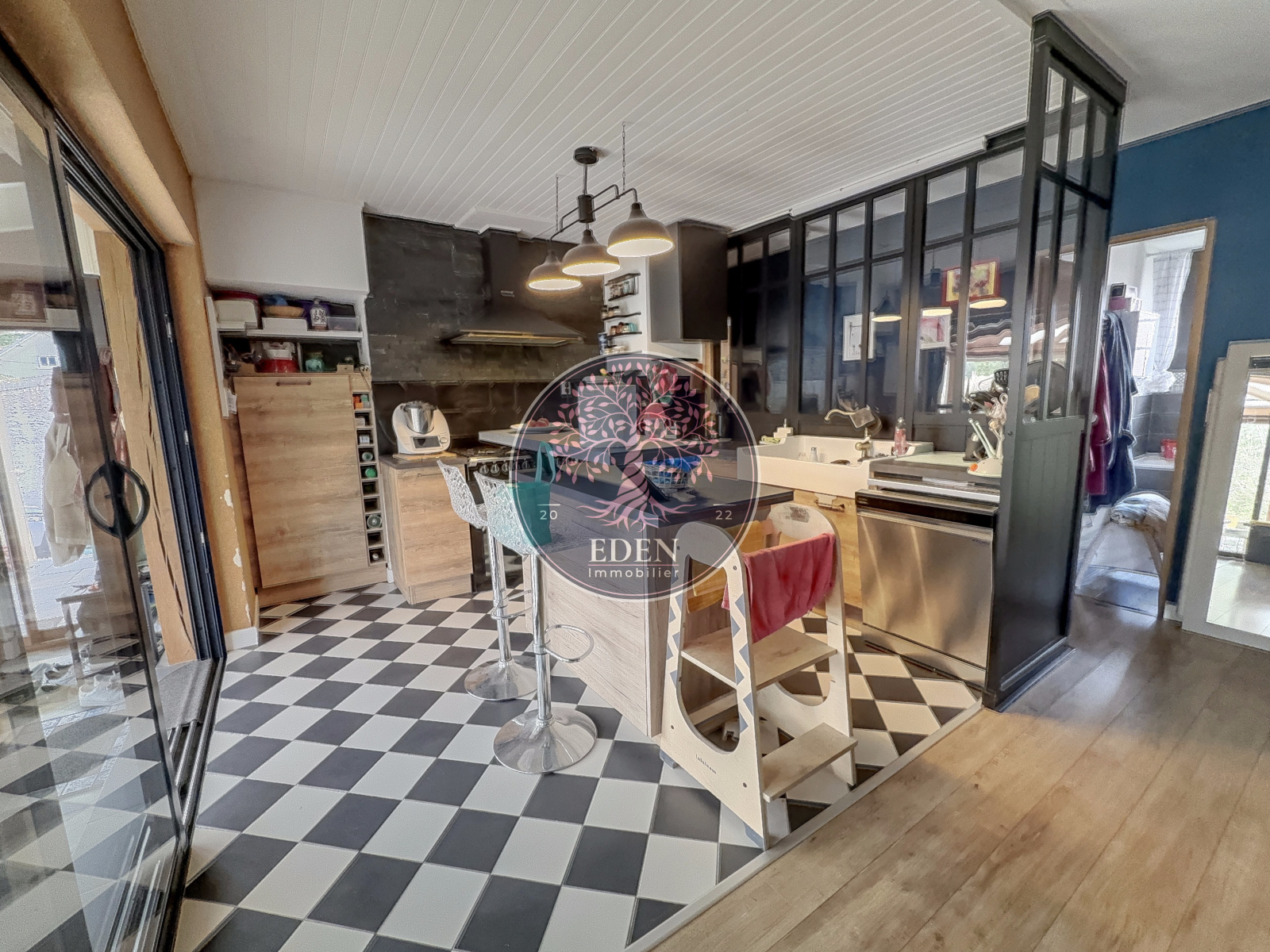 Entrée sur véranda, salon/séjour avec cuisine ouverte aménagée et équipée,3 chambres en rdc, salle de bains avec douche, WC avec lave mains.