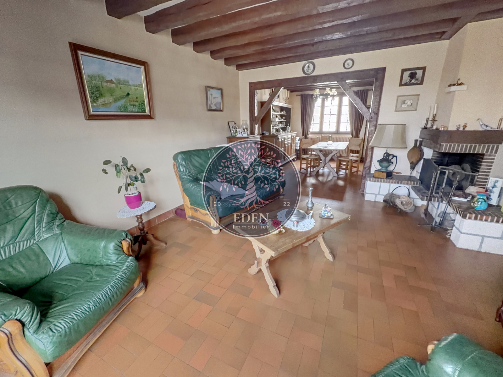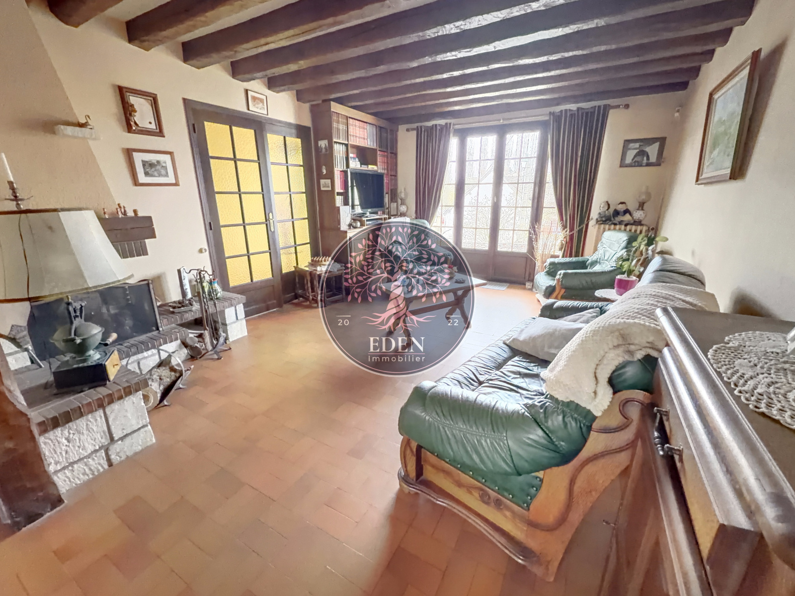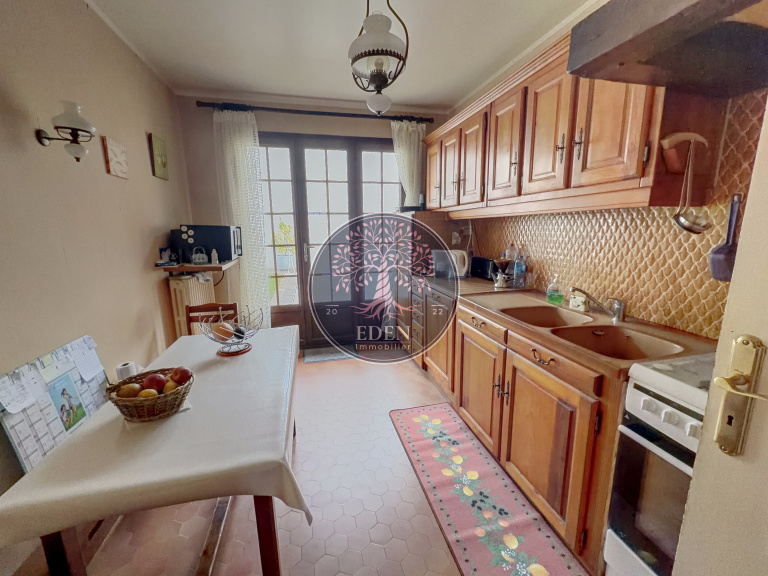 Maison individuelle de 1972 comprenant : entrée avec placards, séjour double de 32m² avec cheminée, cuisine aménagée, 2 chambres, salle de bains, wc.